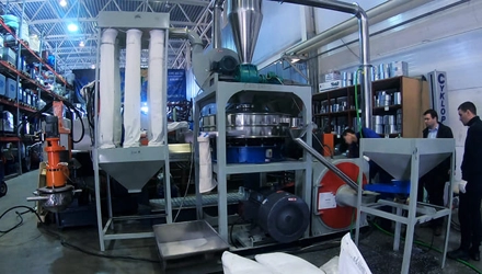 Полученные после дробления частицы насыпают в приемный бункер. С помощью встроенной в корпусе турбины материал продвигается во вращающийся ротор мельницы. Центробежная сила, заданная электродвигателем, отбрасывает полимерные частицы в камеру измельчения.